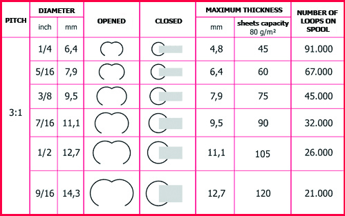 | Manufacturing of double wire in 3:1 pitch in white, black, red, blue, gray, gold and silver color. Size range of double wire and check marks and number of loops on spool are presented in the table below. | ||||||||||||||||||||||||||